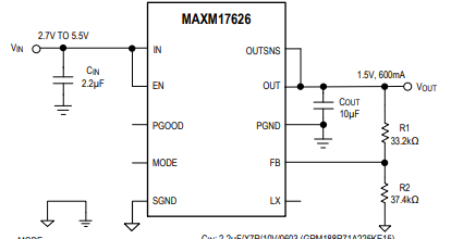 MAXM17625和MAXM17626模塊在穩態操作下采用峰值電流模式控制架構。為減少輸入沖擊電流,這些器件提供1ms固定軟啟動時間。這兩個模塊在輕負載條件下都提供可選PWM或PFM工作模式。選擇PWM模式時,MAXM17625以2MHz固定開關頻率運行,MAXM17626以4MHz固定開關頻率運行。MAXM17625的輸出電壓范圍為0.8V至1.5V,MAXM17626的輸出電壓范圍為1.5V至3.3V。
